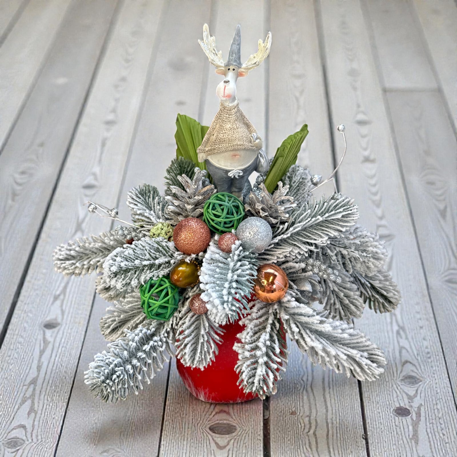 Aranjament de Crăciun cu brad și ren, globuri și figurine festive, decor handmade, tematică de sărbători