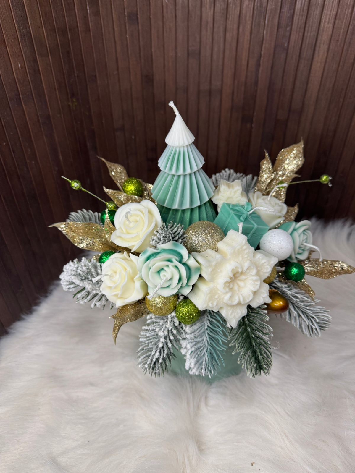 Aranjamentul include un brăduț decorativ din ceară de soia, mini-cadouri și flori din ceară, globuri decorative și elemente de brad artificial cu efect de zăpadă. Toate sunt așezate armonios într-un suport decorativ, transformând întreaga piesă într-un punct de atracție pentru masa de Crăciun, birou, hol sau living.